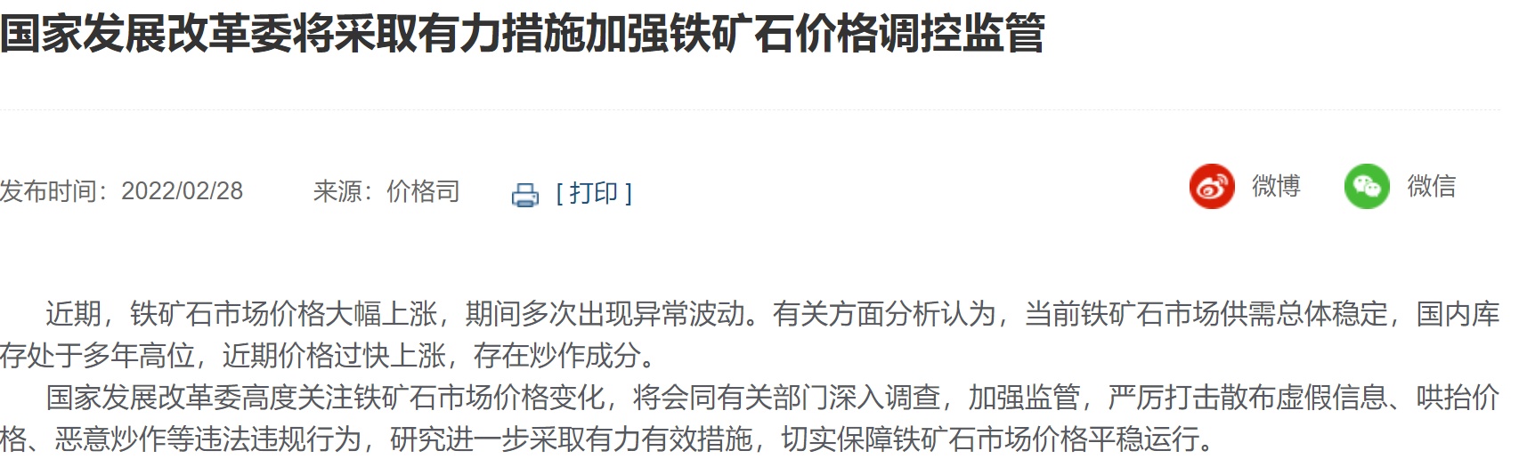 智通财经APP获悉,据发改委价格司消息,近期铁矿石市场价格大幅上涨,期间多次出现异常波动。有关方面分析认为,当前铁矿石市场供需总体稳定,国内库存处于多年高位,近期价格过快上涨,存在炒作成分。国家发展改革委高度关注铁矿石市场价格变化,将会同有关部门深入调查,加强监管,严厉打击散布虚假信息、哄抬价格、恶意炒作等违法违规行为,研究进一步采取有力有效措施,切实保障铁矿石市场价格平稳运行。