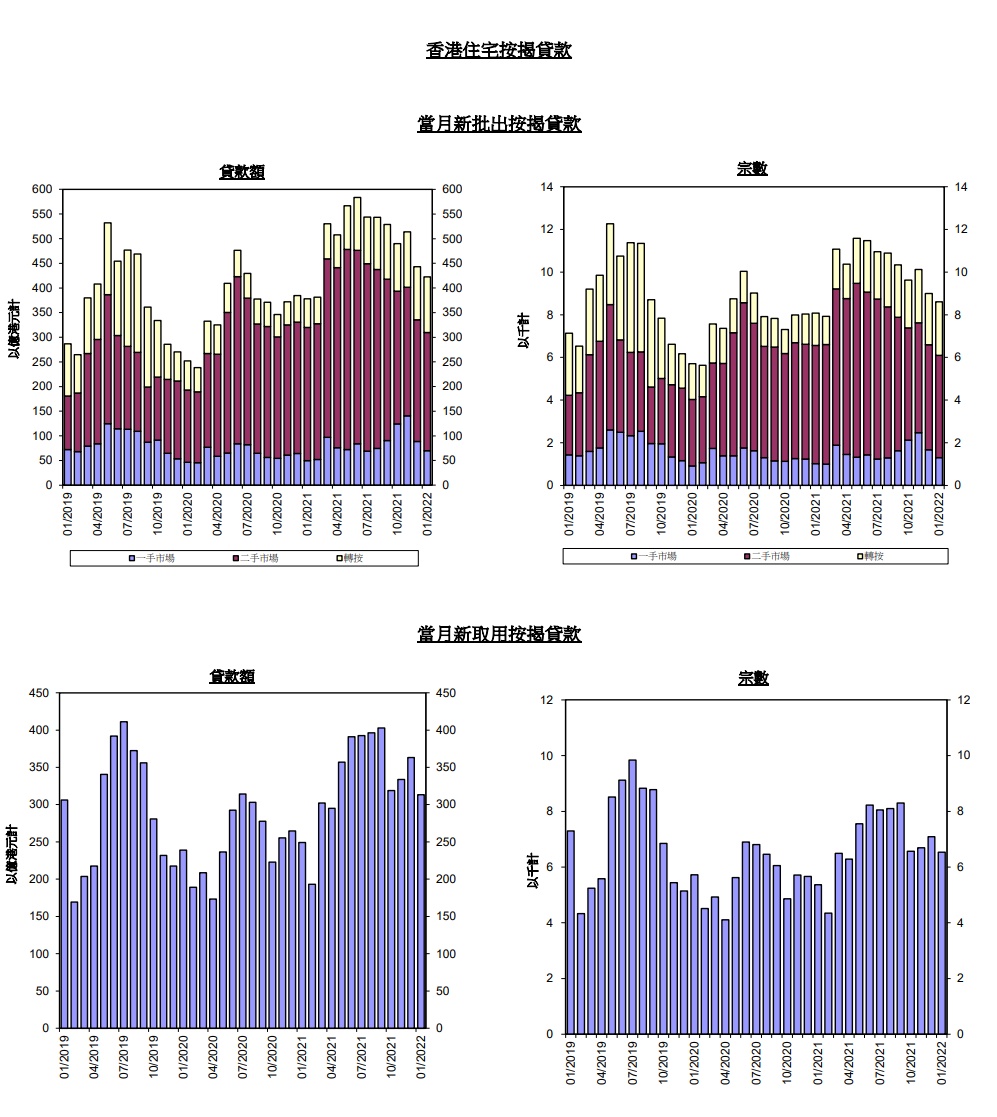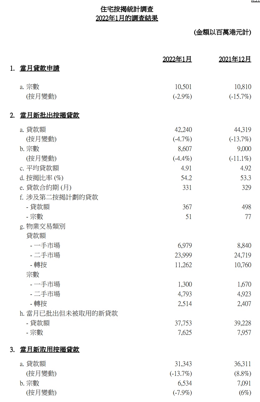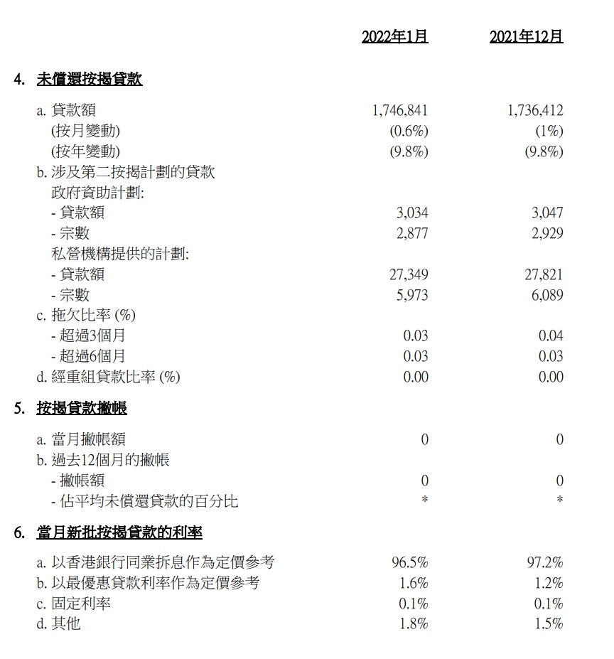 2022年1月底未偿还按揭贷款总额按月增加0.6 %,至17,468亿港元。按揭贷款拖欠比率微降至0.03%,经重组贷款比率维持于接近0%。