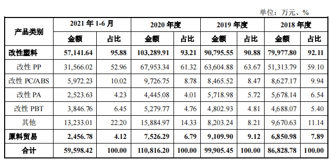 业务表现而言,聚赛龙的主营业务包括改性塑料销售和原料贸易两大类,产品结构相对稳定。报告期各期公司改性塑料销售收入占比分别为92.11%、90.88%、93.21%和95.88%,为公司最主要收入来源。其中,改性PP收入在改性塑料业务收入中占比最高,其各期收入占主营业务收入的比例分别为 59.10%、63.67%、61.32%和 52.96%,主要产品贡献收入均超五成。