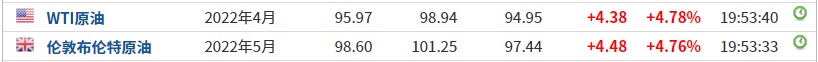 3. 截至发稿,WTI原油涨4.78%,报95.97美元/桶。布伦特原油涨4.76%,报98.60美元/桶。分析师:西方使出SWIFT大招可能将油价迅速拉升至110美元。