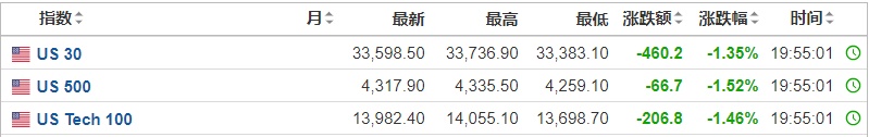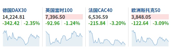 2. 截至发稿,德国DAX指数跌2.35%,英国富时100指数跌1.24%,法国CAC40指数跌3.20%,欧洲斯托克50指数跌3.09%。