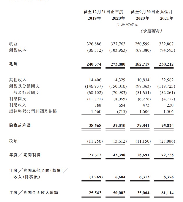 财务状况方面,于2019、2020年以及截至2021年9月30日止九个月,V3 Group的收入分别达到约3.27亿元(单位:新加坡元,下同)、3.78亿元及3.33亿元。期/年内溢利分别达2731.2万元、4339.8万元及7273.8万元。