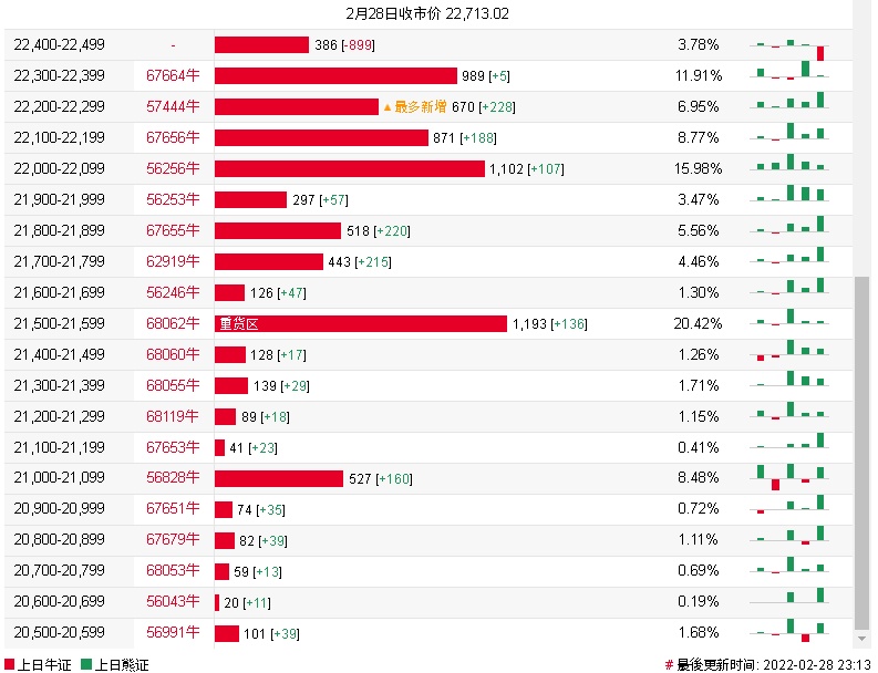 牛证街货重货区在21500-21599区间,该区间最新牛证数量为1193张,较上一交易日增加136张;最多新增在22200-22299区间,该区间最新牛证数量为670张,较上一交易日增加228张。