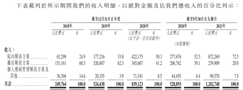 据招股书显示,2021年前九个月公司的收入为人民币12.03亿元,公司三大业务,即院内解决方案、药店解决方案及个人慢病管理解决方案收入分别为人民币8.72亿元、2.40亿元及9057万元,分别占收入的72.5%、20.0%及7.5%。2021年前九个月,公司亏损37.29亿元。
