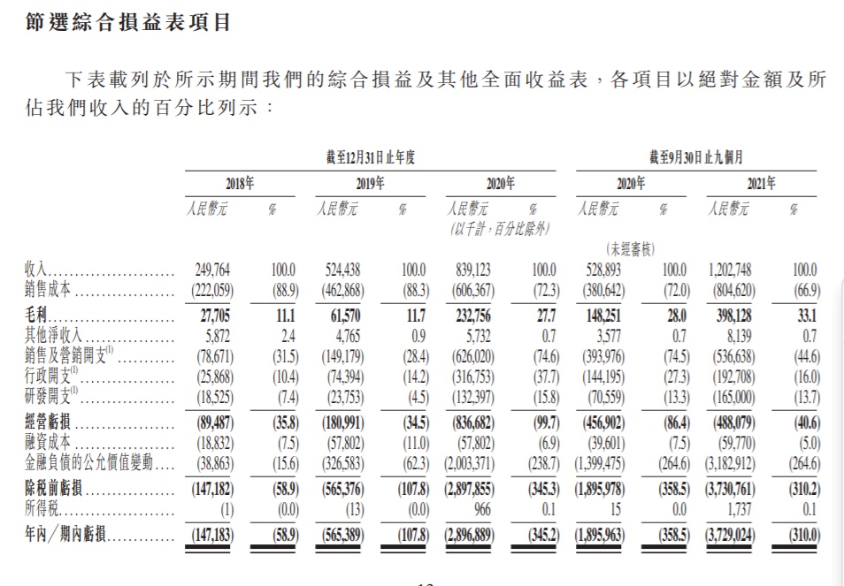 此外,于2018年、2019年及2020年,公司的收入分别为人民币2.5亿元、5.24亿元及8.39亿元。年内亏损分别为人民币1.47亿元、5.65亿元及28.97亿元。