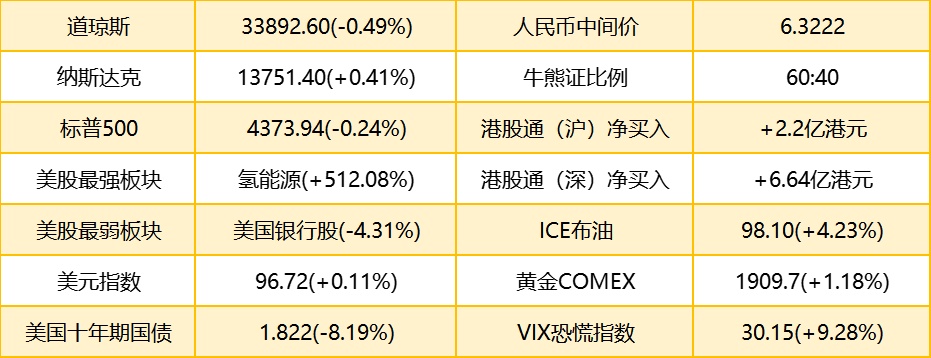 1. 隔夜美股收盘,道指跌166.15点,跌幅为0.49%,报33892.60点;纳指涨56.77点,涨幅为0.41%,报13751.40点;标普500指数跌10.71点,跌幅为0.24%,报4373.94点。港股ADR指数下跌,按比例计算,收报22713点,较香港收市跌0.21点。