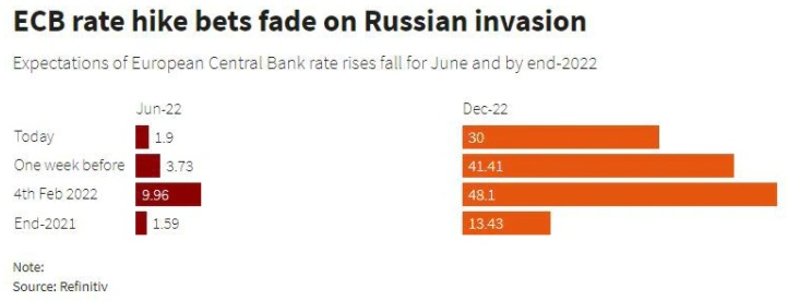 智通财经APP观察到,市场对美联储、英国央行和欧洲央行等激进加息的押注在过去一周已经消退。但周一,市场预期进一步降温,主要是由于欧美对俄罗斯的更严厉制裁,包括禁止部分俄罗斯银行使用SWIFT全球支付系统将打击市场稳定,以及油价飙升将损及欧元区经济,货币市场愈发相信欧洲央行将更晚收紧政策。