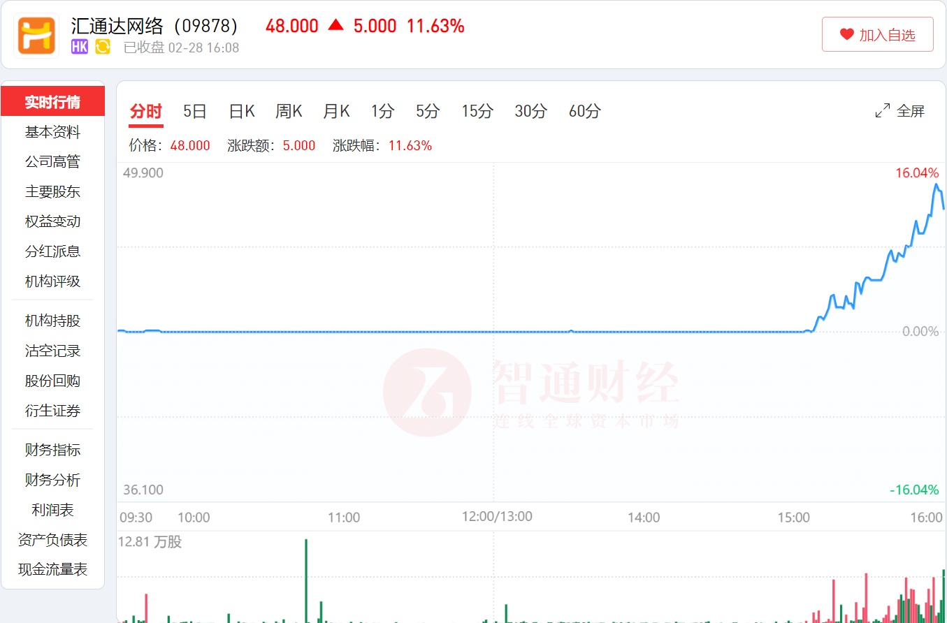 智通财经APP获悉,作为“下沉市场第一股”的汇通达网络(09878.HK),于2月28日收盘后股价为48港元,相较于上一个交易日的43港元,实现5港元的上涨,涨幅达到11.63%,盘中最高价达到49港元。