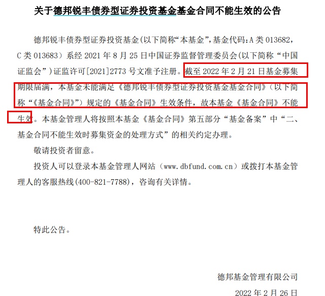 至于发行失败原因,5只基金均在其公告表示:“募集期限届满,未能满足基金备案条件,故基金合同不能生效”。值得注意的是,中长期纯债基金——德邦锐丰原定募集截止日为2022年3月1日。2月22日,德邦基金发布提前结束募集的公告,将该产品的募集截止日提前至2月21日。直至2月26日,基金管理人宣布德邦锐丰债券因未达到基金合同约定的备案条件,故基金合同不能生效。