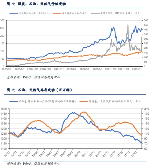 中长期看,基本面产能周期驱动下能源价格有望持续高位运行,并呈上行趋势。虽然美国称将对俄罗斯实施“毁灭性”制裁,但我们认为美不太可能对俄能源进行制裁,因为根据我们能源团队的估算,俄罗斯日出口量在500万桶,而全球原油在今年1~2月的去库存速度大概在100万桶/日,所以如果俄罗斯这部分供给消失或大幅减少,可能会极大拉高油气等能源价格,同时也加剧美国国内通胀。我们认为,自去年出现的全球范围的能源价格上涨本质原因是供给产能周期导致的紧缺,其持续性和强度将远超预期,俄乌冲突作为不确定事件,只是加剧了能源紧张的形势。因此,即使是在俄罗斯没有断供能源的情况下,能源价格也会在供需错配的矛盾下维持高位,并在中长期呈上行趋势。