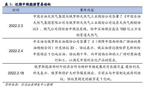 中俄的能源合作有望一定程度加深。中国是俄重要的能源出口方向,2020年日均出口的500万桶石油(含凝析油)中,有100-200万桶流向中国,2021年从俄罗斯进口原油约占总进口量15%,同时我国也是俄罗斯在亚洲地区最大的天然气出口国。俄罗斯在减少流向欧洲的能源同时,有望增加对我国的能源出口,但存在基础设施方面的不确定性。此前,中俄签订天然气大单,宣布在承诺的自2019年未来30年每年向中国输送380亿立方米的天然气(第一年输送50亿立方米,逐渐达到380亿立方米)基础上再增加100亿立方米;俄罗斯官方也曾表示未来对中国煤炭出口要由现在的约5300万吨增加达到1亿吨。我们认为这个量受制于基础设施问题并非马上可以实现的。因为俄罗斯的能源出口一直采取“东张西望”的布局,欧洲已经较为完善的天然气运输消费系统,东部的发展还在起步阶段。中俄的天然气供需渠道有两个,一个是天然气东线管道,设计输气产能380亿方,一个是北极大型LNG项目,约有400万吨LNG出口中国。长期看,中俄能源合作会更加密切,但还需要3-4年的基础设施建设时间。