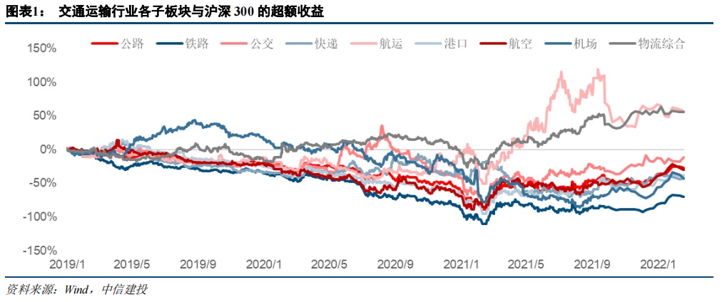 从交运各子板块相对沪深300的表现来看,本周(2月21日-2月25日)交运板块整体有所回调。本周航运、港口板块分别下跌2.44%和1.85%,表现较为稳定。