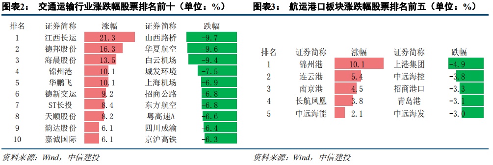 本周(2月21日-2月25日)江西长运、德邦股份和海晨股份领涨,涨幅分别为21.3%、16.3%和13.5%;山西路桥、华夏航空和白云机场本周跌幅为9.7%、9.6%和9.4%。本周航运港口板块中锦州港、连云港、南京港领涨,涨幅分别为10.1%、5.4%和4.5%;上港集团、中远海控和招商港口本周跌幅为4.9%、3.8%和3.3%。