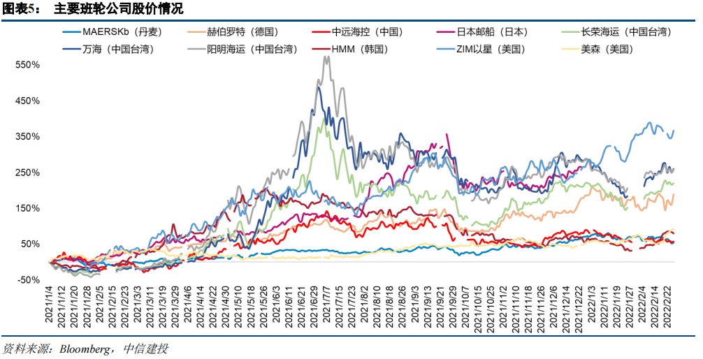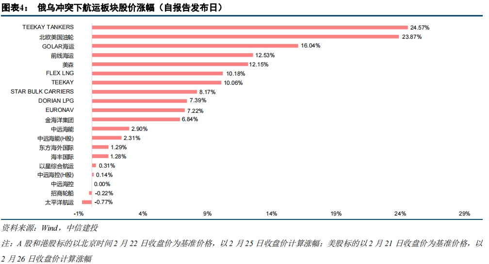 2月23日发布的《俄乌冲突将对航运股产生正面影响》一文提到,油运方面建议关注招商轮船、中远海能、TEEKAY、TEEKAYTANKE、前线海运、Euronav、北欧美国油轮。LNG运输方面建议关注GOLAR海运、FLEXLNG。干散货运方面建议关注太平洋航运、STARBULK、金海洋集团。集运方面,继续维持中远海控、东方海外国际和海丰国际“买入”评级,建议关注ZIM、美森。