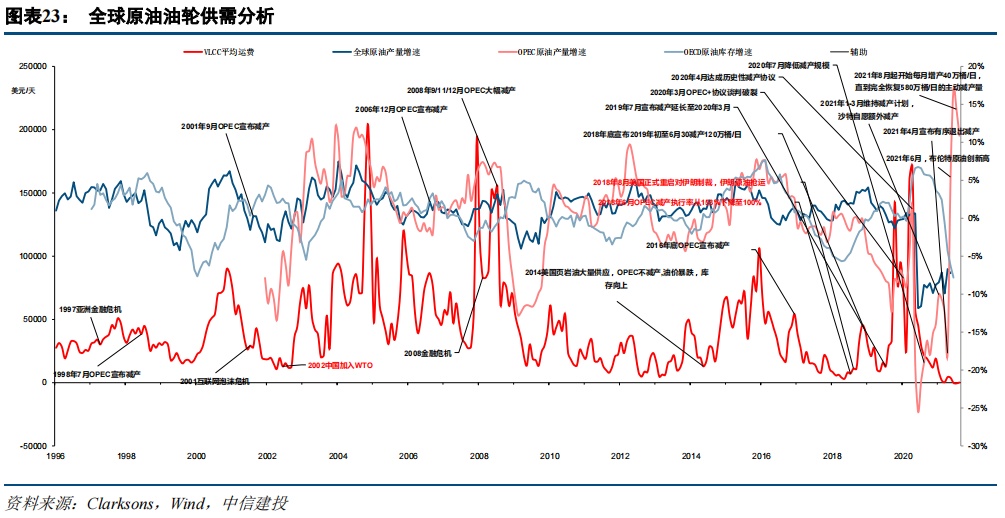 复盘过去24年的油运历史,我们发现:(1)供需边际差是油运运价的决定因素(2)油运运价水平与全球原油产量增速、OPEC原油产量增速、OECD国家的原油库存水平高度正相关(3)运价与运力增速呈高度负相关(4)每一次的OPEC原油减产都会对油运市场产生负面冲击。