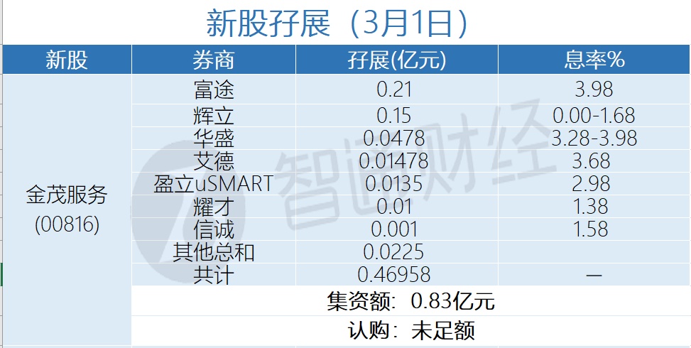 智通财经APP获悉,金茂服务(00816)正在招股中。截至3月1日,富途、辉立、华盛、艾德等合计为其借出孖展近0.46958亿港元,认购未足额。