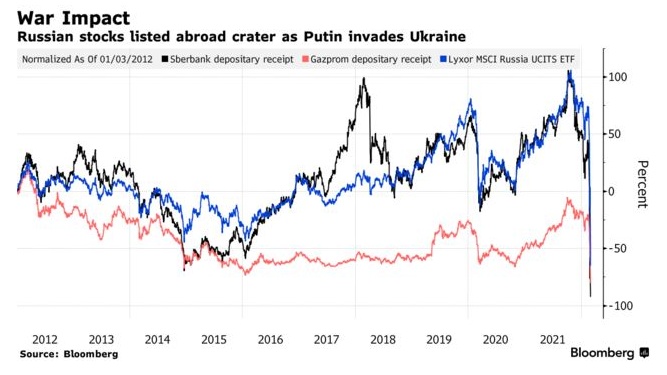 另外,与俄罗斯相关的ETF也受到了冲击。在巴黎上市的Lyxor MSCI Russia UCITS(追踪MSCI Russia指数)在前一交易日跌去近半价值后,周二续跌33%。在美国上市、追踪俄罗斯股市的最大ETF俄罗斯ETF-MarketVectors(RSX.US)继周一暴跌30%后,周二盘前跌逾15%。