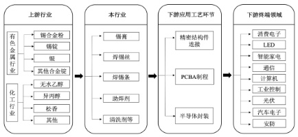 据了解,微电子焊接材料具有“小产品、大市场”的特点,产业链上游主要是有色金属冶炼行业、化工行业;下游应用领域广泛,电子制造过程中的电子装联环节均要用到微电子焊接材料。