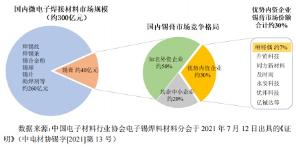 以唯特偶的主要产品锡膏为例,随着电子元器件的小型化、精细化发展,SMT表面贴装技术的应用和发展成为行业主流,锡膏产品在微电子焊接材料中的比重日益提升,行业发展重心亦向锡膏产品倾斜,然而国内锡膏市场约50%的销售份额由美国爱法、日本千住、美国铟泰、日本田村等知名外资企业占据,单一内资企业的市场份额相对较小。