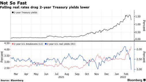 尽管自上周俄乌冲突爆发以来,股市的风险偏好有所减弱,但对债券作为避险工具的需求一直很旺盛。基准美国国债收益率在两周前达到2.06%的疫情前高点后,已经下跌了约30个基点。