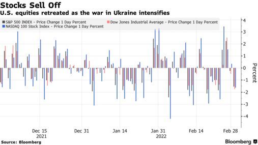 标普500指数下跌1.6%,除能源以外的所有板块均收跌。银行和科技公司股价跌幅最大,苹果(AAPL.US)宣布将停止在俄罗斯销售所有产品后股价下跌。在俄乌冲突爆发前曾突破2%的10年期美国国债收益率跌回1.75%以下。
