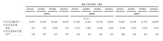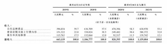 细分来看,自有品牌产品收入方面,2019年收入为3.96亿元,2020年为6.37亿元,2021年前三季度收入为6.38亿元;会员订阅及线上付费内容收入方面,2019年为1.51亿元,2020年为3.38亿元,2021年前三季度收入为3.8亿元,较上年同期的2.49亿元增长32.8%;广告及其他服务收入方面,2019年收入为1.16亿元,2020年收入为1.32亿元,2021年前三季度收入为1.4亿元。