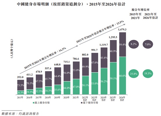 灼识咨询报告显示,2021年中国的健身人群为3.03亿,预计到2026年将达到4.2亿人,而且近五年来,中国健身产业市场规模每年增速在30%,而中国健身人群的平均支出仅为2596元,不到美国健身人群平均支出的1/5,全民健身的巨大的市场有待挖掘。