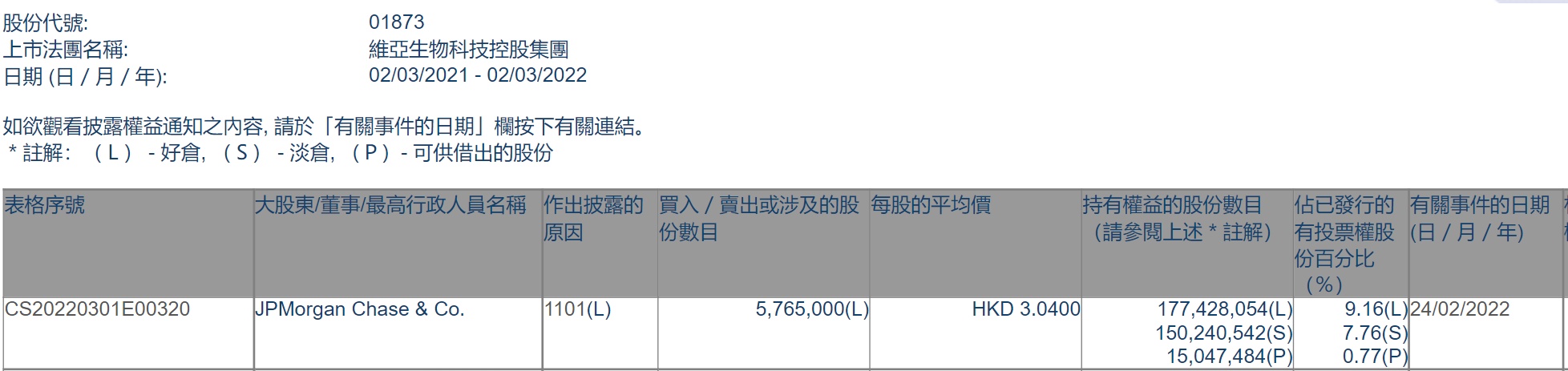 智通财经APP获悉,香港联交所最新资料显示,2月24日,小摩增持维亚生物(01873)576.5万股,每股作价3.04港元,总金额为1752.56万港元。增持后最新持股数目约为1.77亿股,最新持股比例为9.16%。