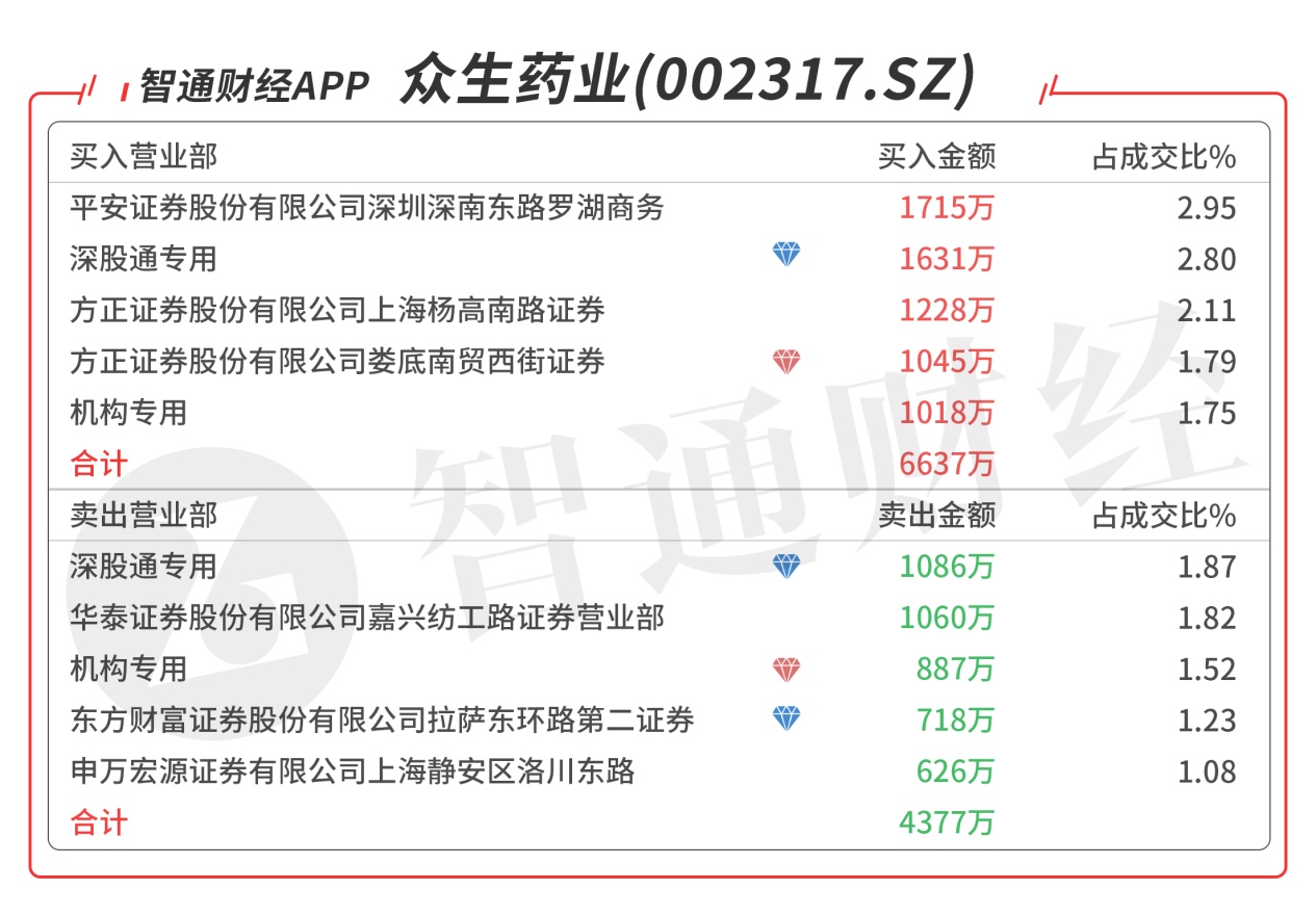 众生药业(002317.SZ):多主力现身龙虎榜,深股通对倒净买入546万元,机构席位对倒净买入224万元,当日净买入2659万元,该股今日强势涨停,预计压力位在13元附近。