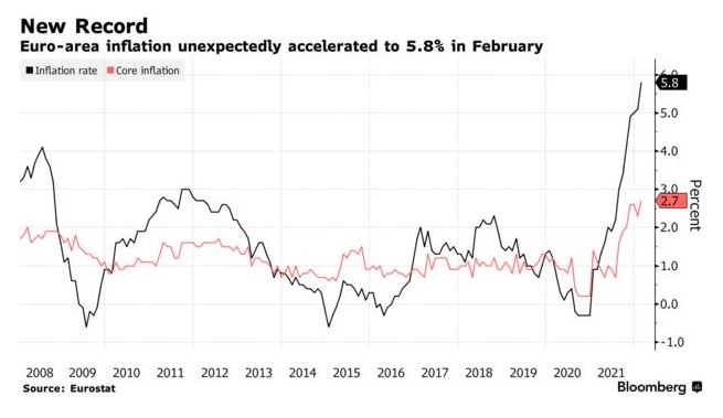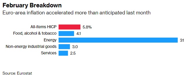 最新数据显示,欧元区2月份消费者价格指数同比上涨5.8%,高于上月的5.1%,也高于预期的5.6%。核心CPI同比增长2.9%。
