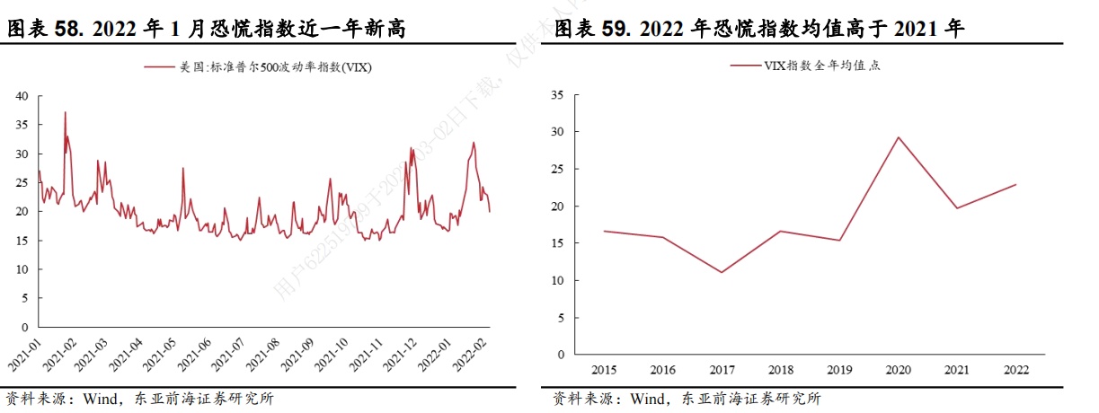结合恐慌指数来看,随着地缘政治因素的扰动,近期以来波动率指数(VIX)强势走高,于2022年3月1日达到33.32,刷新近一年新高。此外,据相关研报显示,至2月24日,VIX指数2022年均值为24.19点,高于2021年全年19.67点。可以看到,在整体市场波动情况相对较高的背景下,全球经济的不确定性或将进一步对黄金价格带来一定支撑。