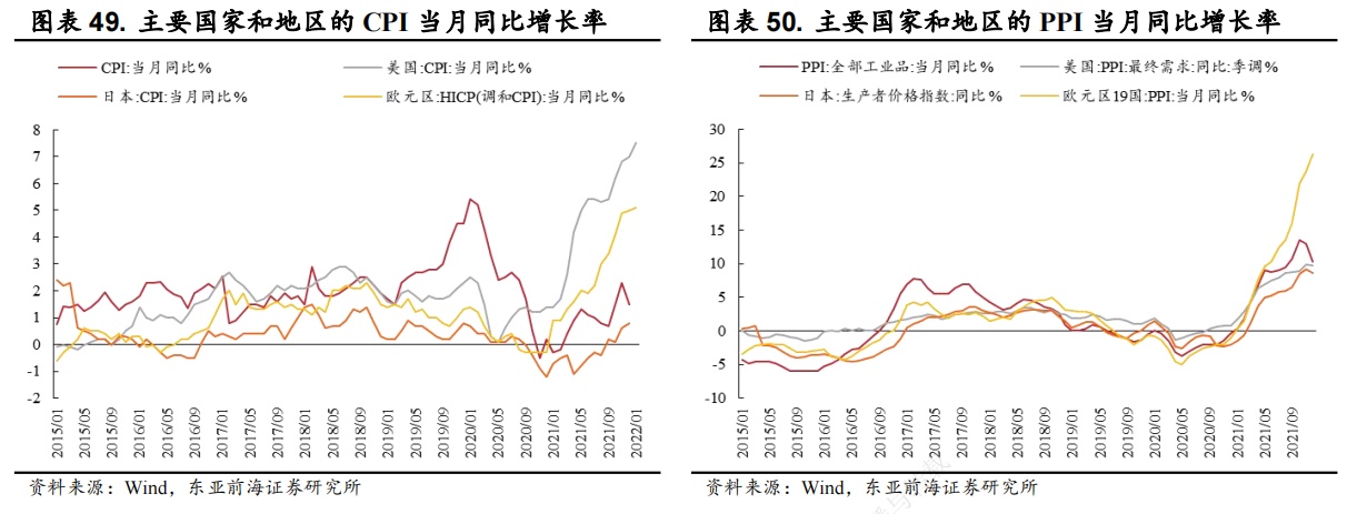 智通财经APP了解到,自2021年以来,世界主要国家和地区CPI和PPI一直呈上涨趋势。CPI方面,截至2022年1月,美国、欧元区同比增长7.5%和5.1%,明显高于近三年来的平均增长水平,美国CPI更是创出了新高。PPI方面,2021年12月,中国、美国、日本和欧元区19国的PPI增长率分别达到10.3%、9.8%、8.7%和26.2%,纷纷进入历史高位。PPI的上涨,往往会带动CPI的进一步上涨,因此预期未来CPI仍会进一步走高,通胀压力加大。