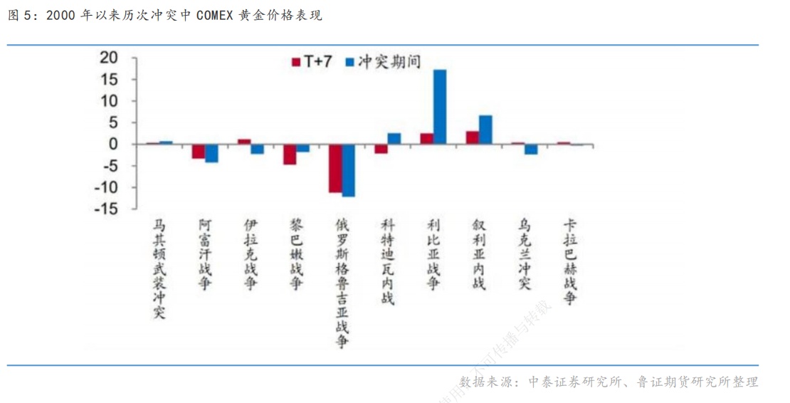 据鲁证期货复盘历次冲突前后黄金价格的变化,可以发现,金价一般在开战前走高,但当战局明朗后,黄金价格并不必然上涨。原因就在于,战前市场已有充分预期,而战争正式开始后,在利空出尽的背景下,黄金价格有回落的可能。新世纪以来的十次地缘政治冲突期间,黄金价格5次上涨与5次下跌。