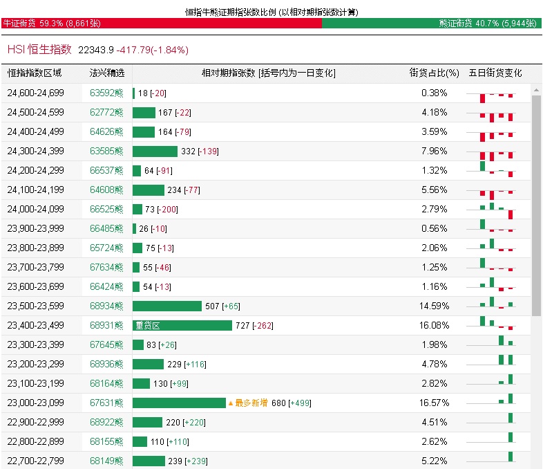 法兴恒指牛熊证街货分布图中的数据显示,熊证街货重货区在23400-23499区间,该区间最新熊证数量为727张,较上一交易日减少262张;最多新增在23000-23099区间,该区间最新熊证数量为680张,较上一交易日增加499张。