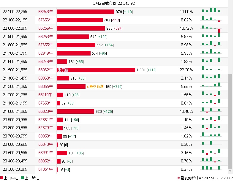 牛证街货重货区在21500-21599区间,该区间最新牛证数量为1331张,较上一交易日增加119张;最多新增在21300-21399区间,该区间最新熊证数量为490张,较上一交易日增加216张。