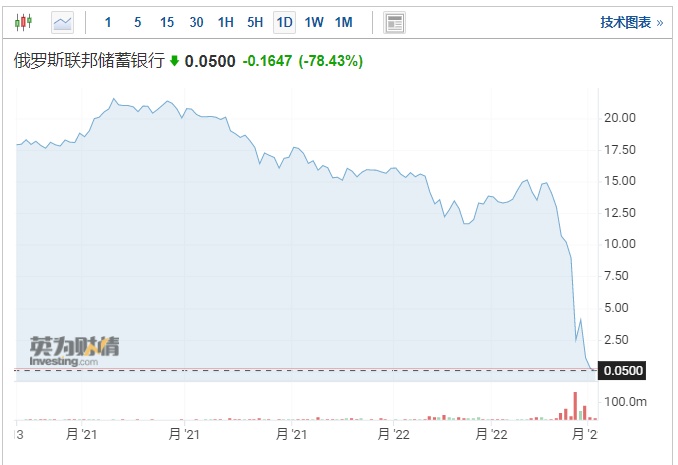 Sberbank的股价在伦敦暂时收跌78% 以上。自今年年初以来,该银行已经损失了 99.9% 的市值。