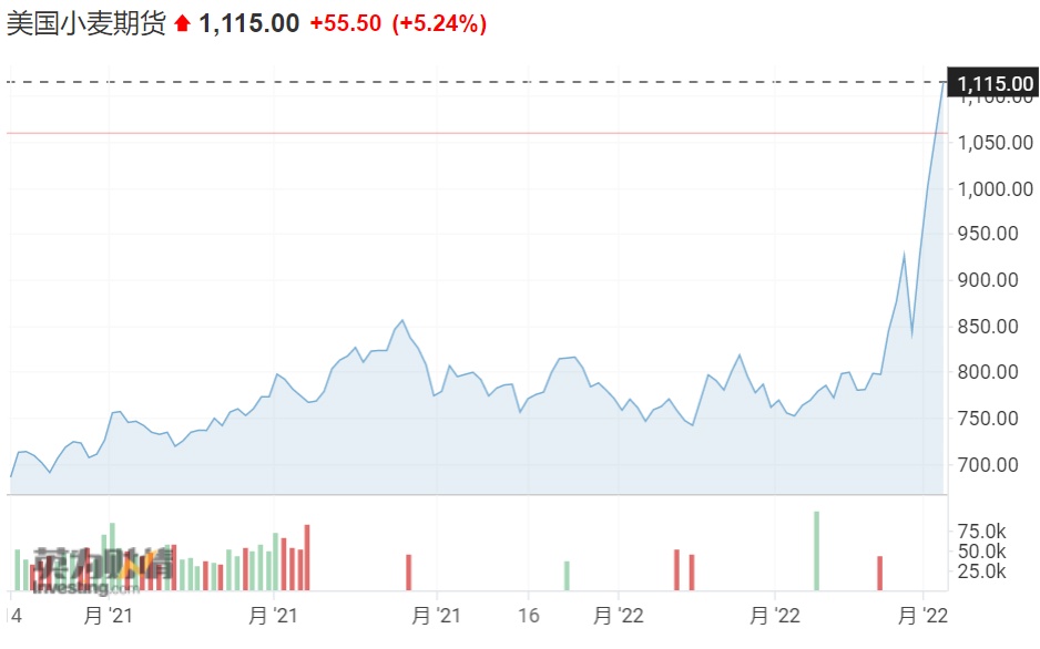 智通财经观察到,芝商所小麦期货自2月25日以来几近直线拉升,截至发稿,该期货价格上涨5.24%,报11.15美元/蒲式耳。
