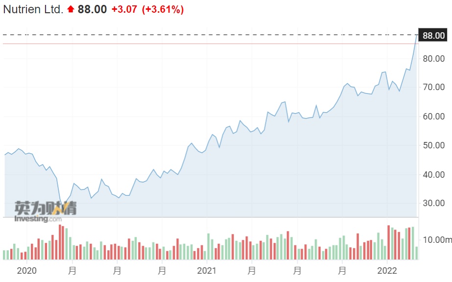 在去年北美化肥价格频创10几年新高的情况下,这两家公司的股票也表现出色。Nutrien股价从疫情开始后的地点一直处于上升通道,去年屡创新高,在乌克兰危机开始后,股价更是陡峭走高,该公司今年迄今上涨27.5%。