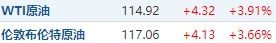 智通财经APP注意到,布伦特原油期货一度涨至每桶118.22美元,为2013年2月以来的最高水平。截至发稿,布油涨3.66%,报117.06美元;WTI原油涨3.91%,报114.92美元。