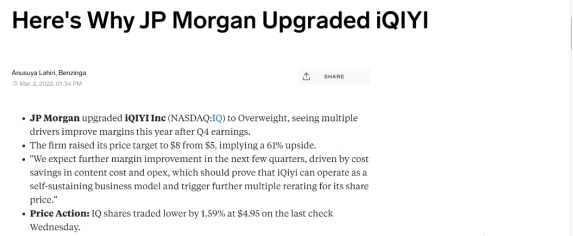 3月3日, JP Morgan将爱奇艺(IQ.US)评级从中性上调为增持。在纪要中该公司表示,预计未来几个季度的利润率将进一步提高,这将证明爱奇艺可以作为一种自主循环的商业模式运营,并引发对其股价的进一步多重重估。考虑到外部环境的改善与运营效率提升,JP Morgan此次将爱奇艺目标价从5美元上调至8美元,这意味着还有61%的上涨空间。