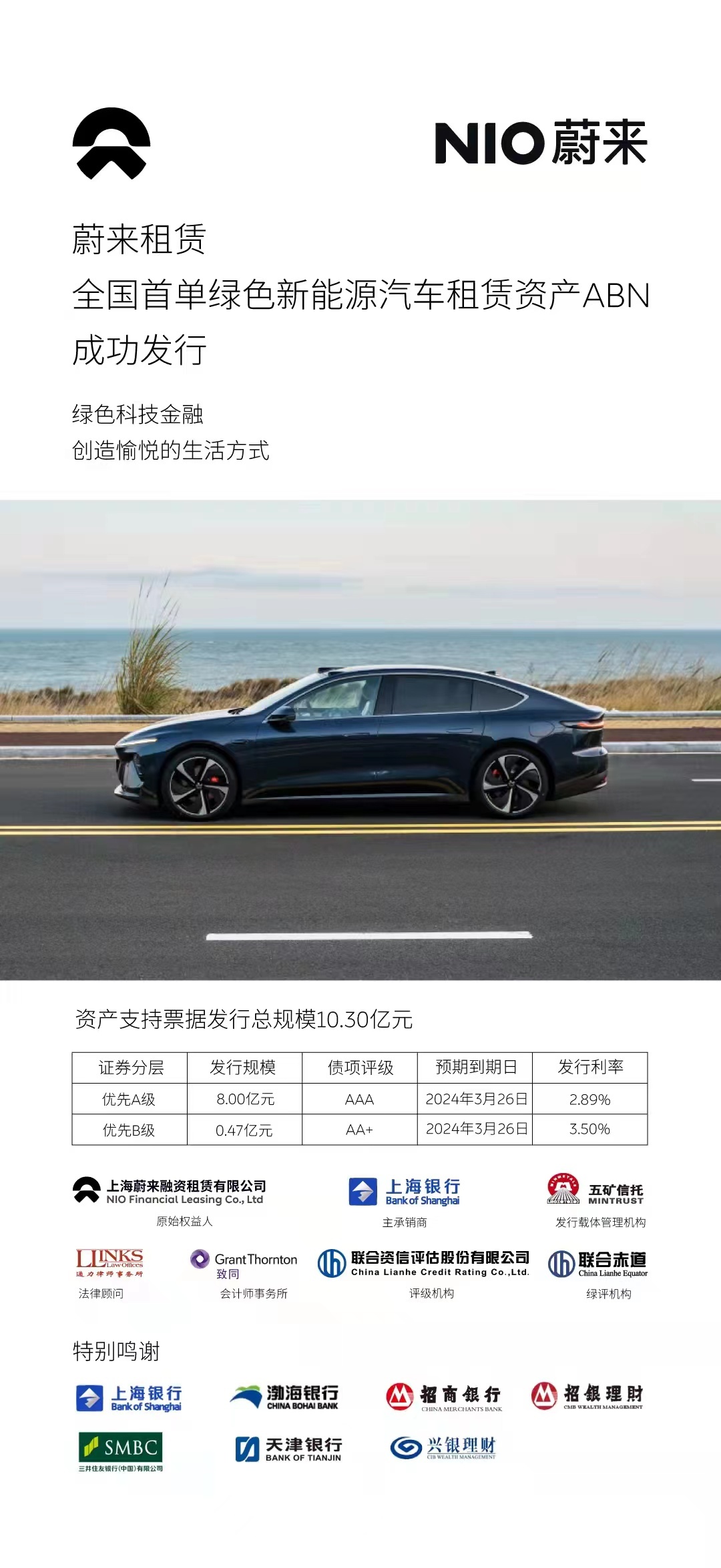 2022年03月03日,“上海蔚来融资租赁有限公司2022年度第一期绿色定向资产支持票据”在银行间市场成功发行。蔚来下属企业上海蔚来融资租赁有限公司为发起机构,上海银行担任主承销商。项目总规模10.30亿元人民币,优先A级的票面利率2.89%,募集资金将全部用于蔚来智能电动汽车业务投放。蔚来融资租赁主要负责为购买蔚来智能电动汽车的用户提供融资租赁解决方案,本次产品发行受到投资人的积极认购,彰显了资本市场对于蔚来品牌的高度认可和支持。