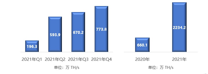 2021年四季度公司销售总算力为773.8万TH/s,同比2020年第四季度增长了3558.8%,环比2021年第三季度增长了15.5%。销售总算力连续增长主要缘于强劲的市场需求和交付能力。2021年全年,公司销售总算力为2234.2万TH/s,同比2020年全年销售总算力增长了238.5%。