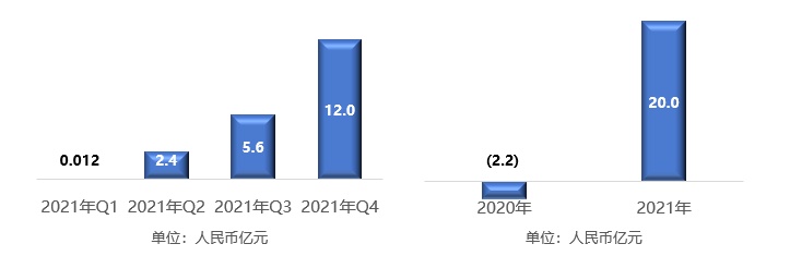 2021年第四季度归属于普通股东的净利润从2021年第三季度的5.576亿元人民币增长为11.965亿元人民币(合1.878亿美元),环比增长114.6%;而2020年同期亏损为7195.5万元人民币。2021年全年,归属于普通股东的净利润为20.003亿人民币(合3.139亿美元), 2020年同期亏损为2.151亿元人民币。