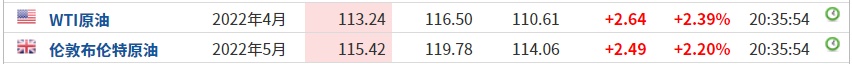 3. 截至发稿,WTI原油涨2.39%,报113.24美元/桶。布伦特原油涨2.20%,报115.42美元/桶。
