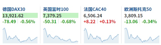 2. 截至发稿,德国DAX指数跌0.56%,英国富时100指数跌0.68%,法国CAC40指数涨0.13%,欧洲斯托克50指数跌0.34%。