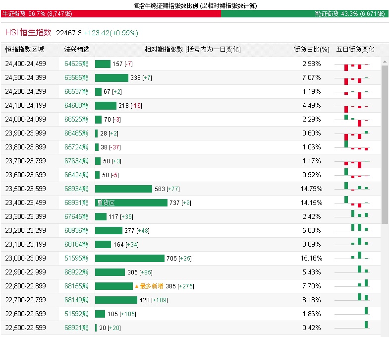 法兴恒指牛熊证街货分布图中的数据显示,熊证街货重货区在23400-23499区间,该区间最新熊证数量为737张,较上一交易日增加9张;最多新增在22800-22899区间,该区间最新熊证数量为385张,较上一交易日增加275张。