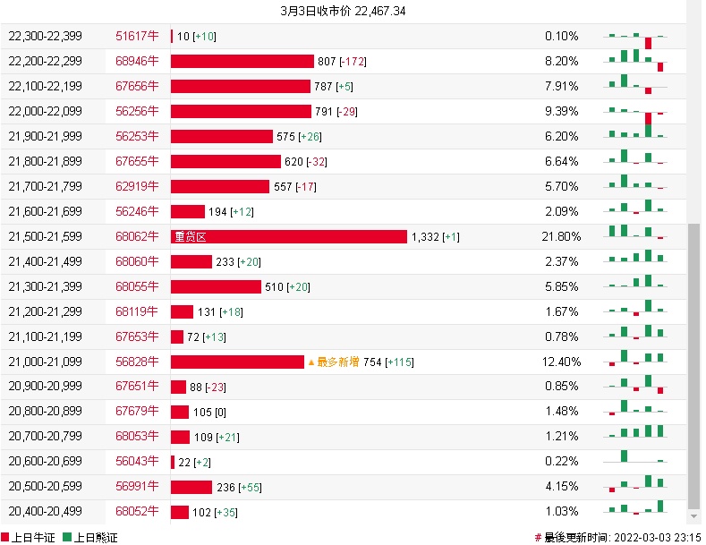 牛证街货重货区在21500-21599区间,该区间最新牛证数量为1332张,较上一交易日增加1张;最多新增在21000-21099区间,该区间最新熊证数量为754张,较上一交易日增加115张。