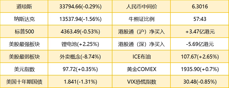 1. 隔夜美股收盘,道指跌96.69点,跌幅为0.29%,报33794.66点;纳指跌214.07点,跌幅为1.56%,报13537.94点;标普500指数跌23.05点,跌幅为0.53%,报4363.49点。港股ADR指数下跌,按比例计算,收报22057点,较香港收市跌409.82点或1.86%。中概互联网指数ETF继续大跌。