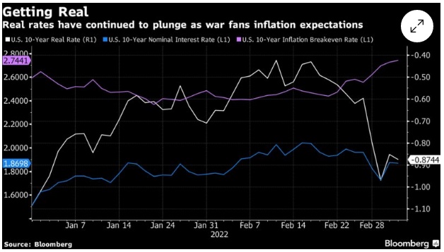 由于乌俄战争刺激了通胀预期,实际利率继续下跌