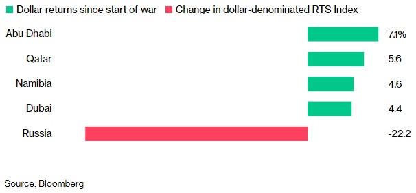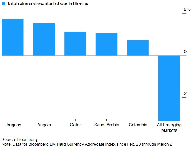 尽管自俄乌冲突发生以来,Bloomberg新兴市场硬通货综合指数下跌了3%,但该指数涵盖的81个成员国中,有15个国家正在产生正向回报。其中大多数是大宗商品出口国,沙特阿拉伯、安哥拉、乌拉圭和卡塔尔排名前列。在以本国货币计价的领域,尼日利亚债券表现最佳。